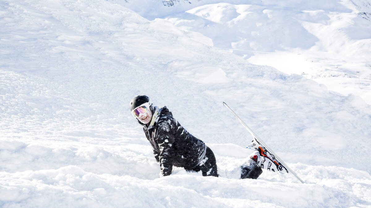 Skier hilariously slips down the stairs during live snow report